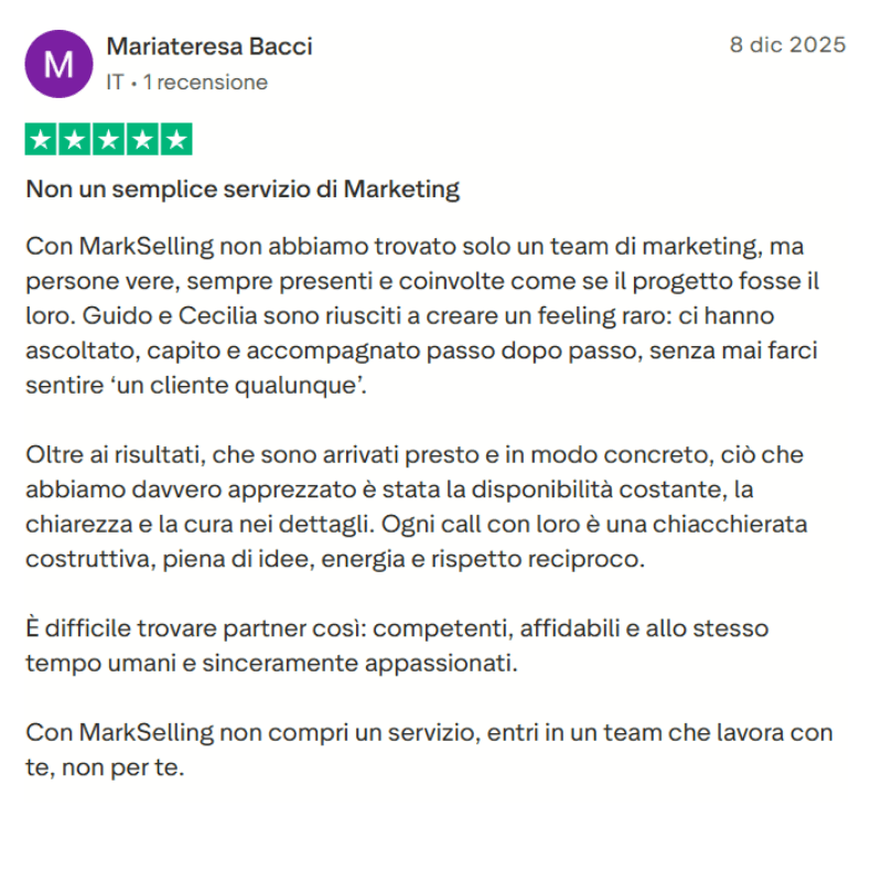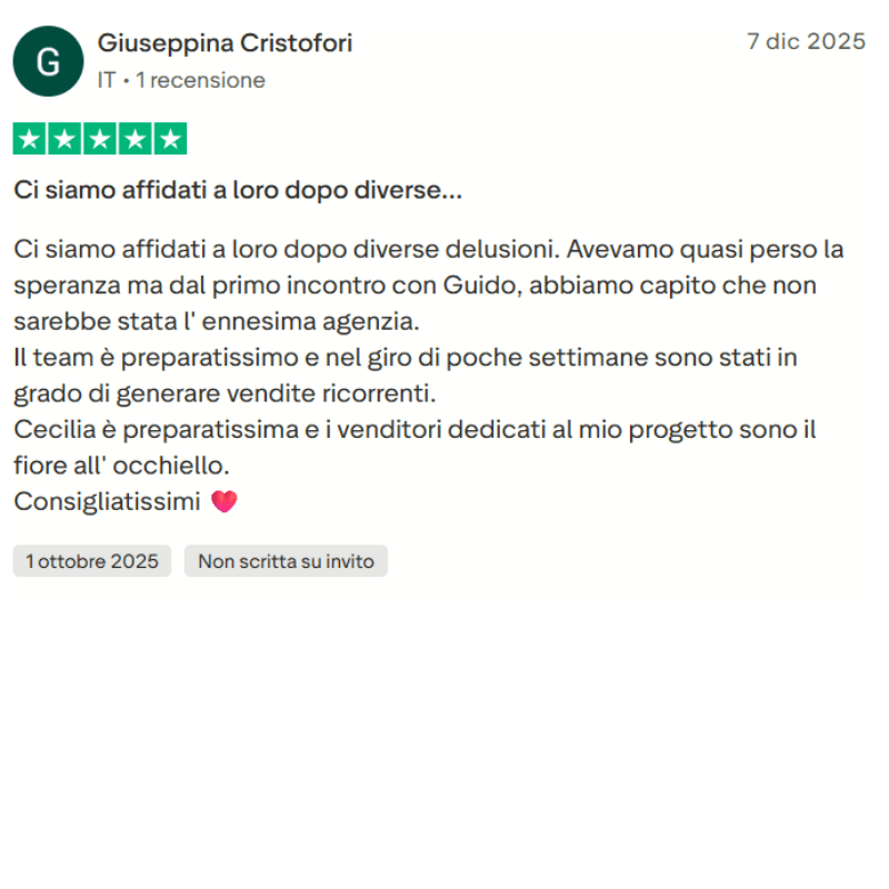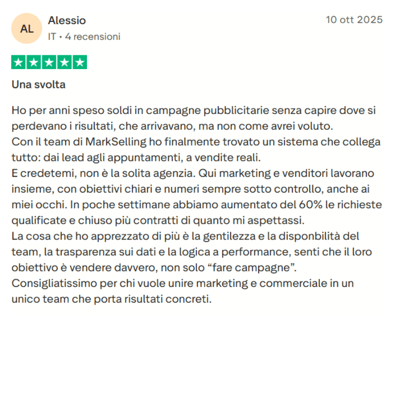 Il risultato? Tra 5 giorni avrai una macchina da fatturato per riceverai i primi appuntamenti fissati da lead che consideravi persi. Se deciderai di fermarti qui, avrai in mano un metodo e una piattaforma che funzionano anche senza di noi.